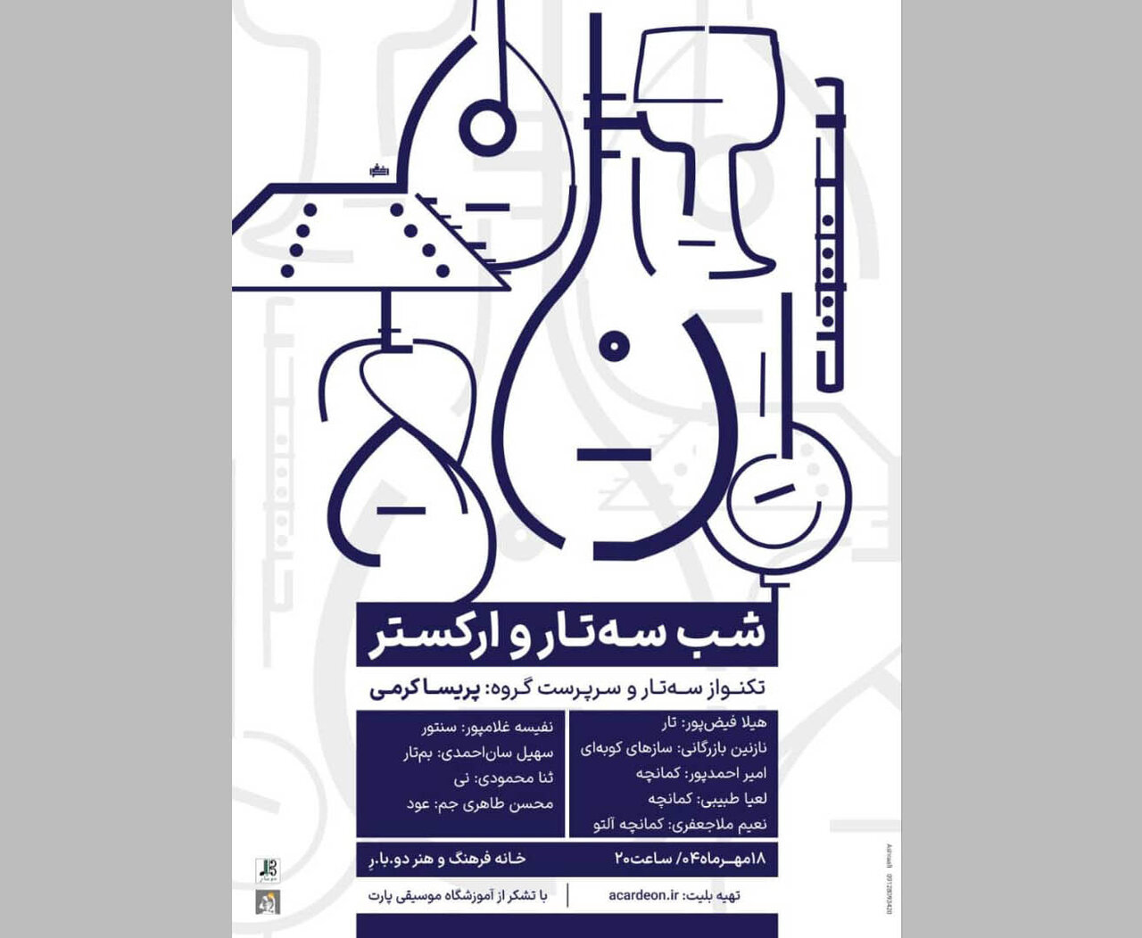 به گزارش خبرگزاری نیوز تودی به نقل از روابطعمومی پروژه، پروژه موسیقایی «شب سه تار و ارکستر» با سرپرستی و تک نوازی سه تار پریسا کرمی روز جمعه هجدهم مهر در مجموعه «دو.با.ر» پیش روی مخاطبان قرار میگیرد.