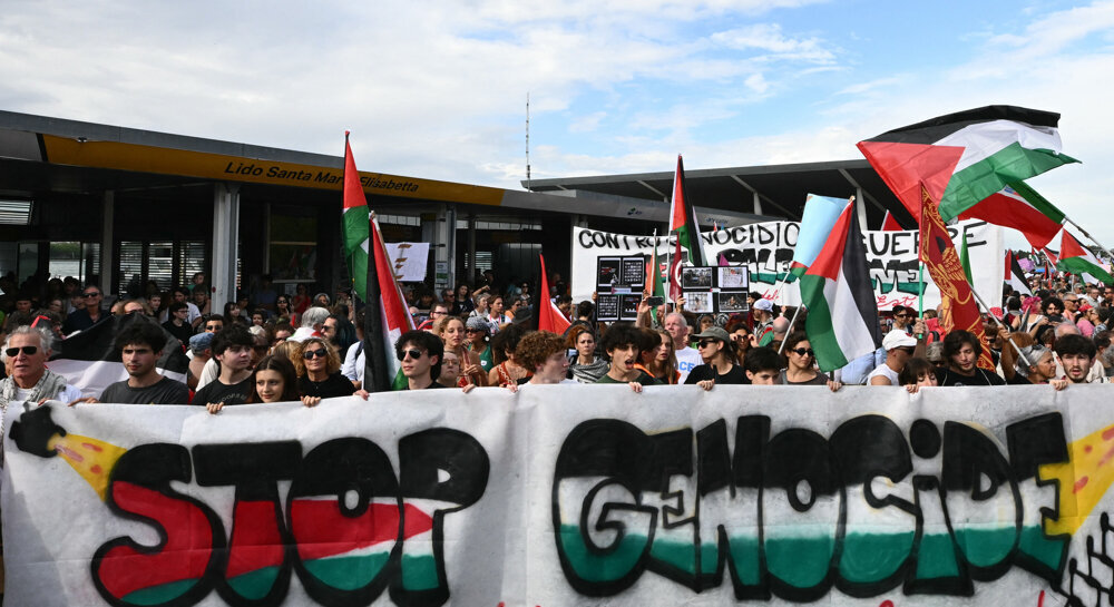 این تظاهرات که عصر شنبه به ابتکار گروههای حامی فلسطین در شمالشرقی ایتالیا برگزار شد، تنها چند کیلومتر دورتر از فرش قرمز جشنواره انجام گرفت. جمعیت حاضر شعارهایی همچون «نسلکشی را متوقف کنید!» و «فلسطین آزاد» سر دادند.